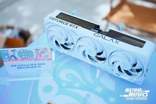 作为展位上最强的存在,影驰GeForce RTX 5080 金属大师白金版 OC吸引了最多的目光。其核心基于最新的Blackwell架构,支持多针生成技术,拥有恐怖的10752个CUDA核心,加速频率能够达到2655MHz。再加上16GB GDDR7 30Gbps大容量超快显存,性能极为强悍。颜值方面,其采用铝合金装甲设计,包括上盖、中框、背板等全部为金属材质,质感出众,再加上白色外观,颜值至高令人心动。三把90mm的霜环风扇提供了充足的风量,同时噪音更低。强悍的性能、出众的颜值、优秀的做工,让其成为影驰展位上的焦点,不仅吸引了热爱游戏的同学,设计、影视专业类的同学也非常关注。