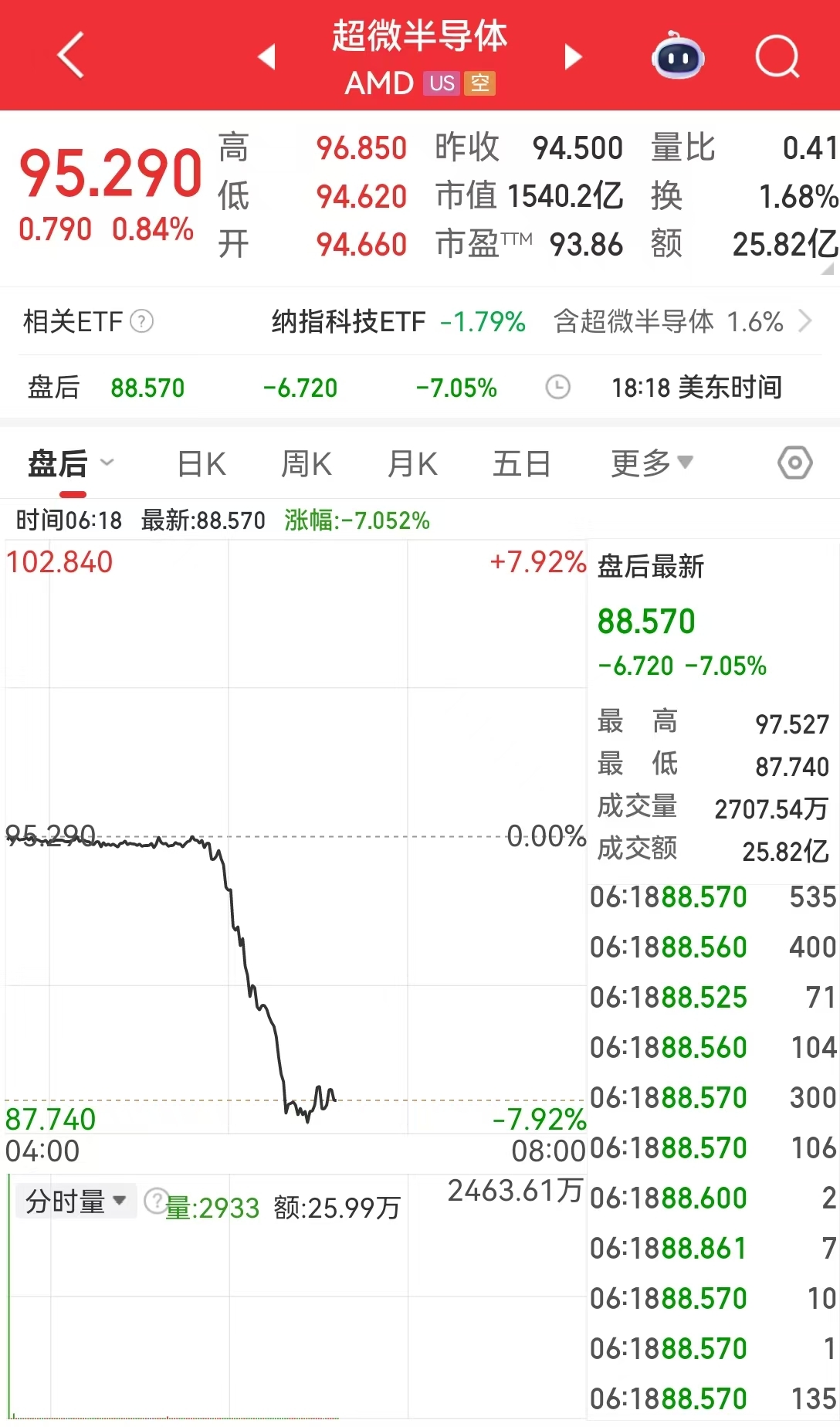 美股盘后,AMD一度跌超7%。博通跌4%,美光科技跌3.7%,台积电ADR跌3.2%,Palantir跌2.2%,英特尔跌1.7%,C3.ai跌1.7%,特斯拉跌1.4%,苹果跌1.3%,高通和Meta也跌超1%。