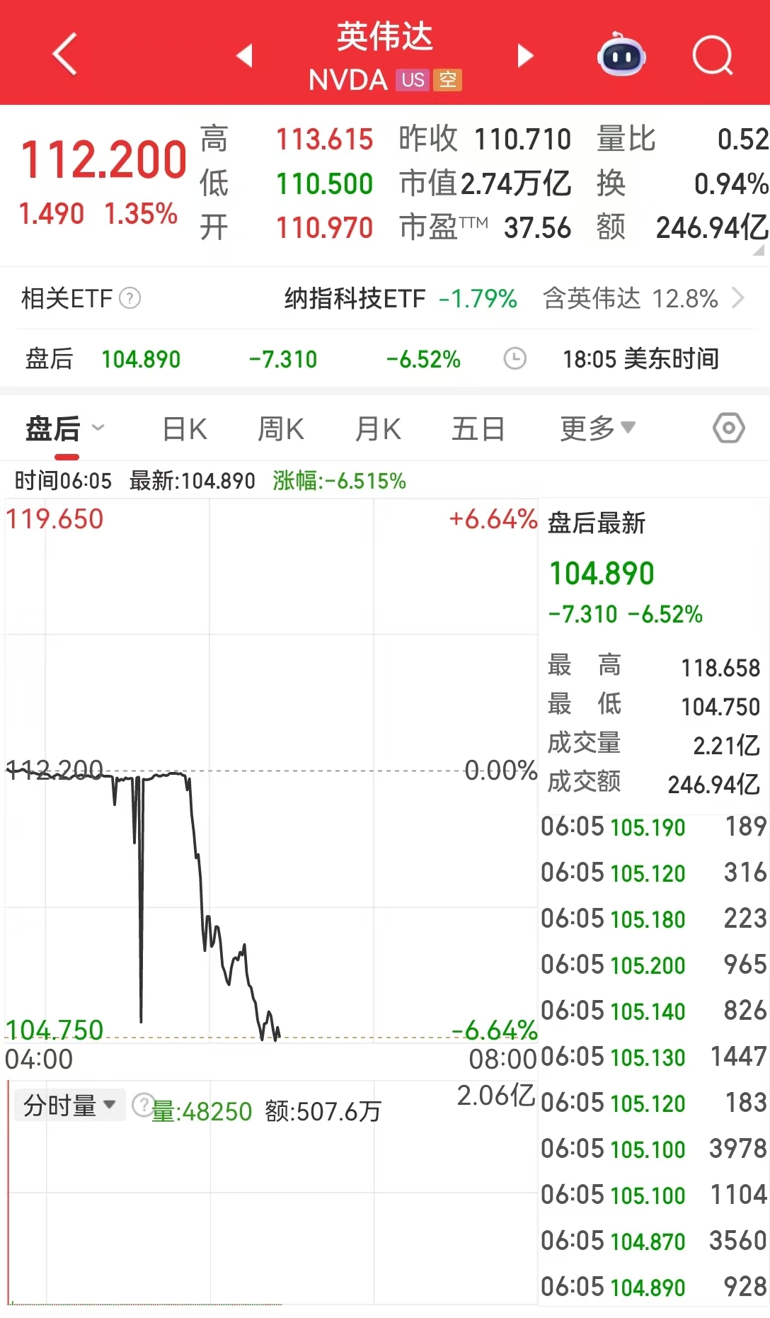 北京时间4月16日,截至发稿,英伟达美股盘后持续走低,现跌6.52%,报104.89美元,市值一度蒸发1784亿美元(约合人民币13051亿元)。