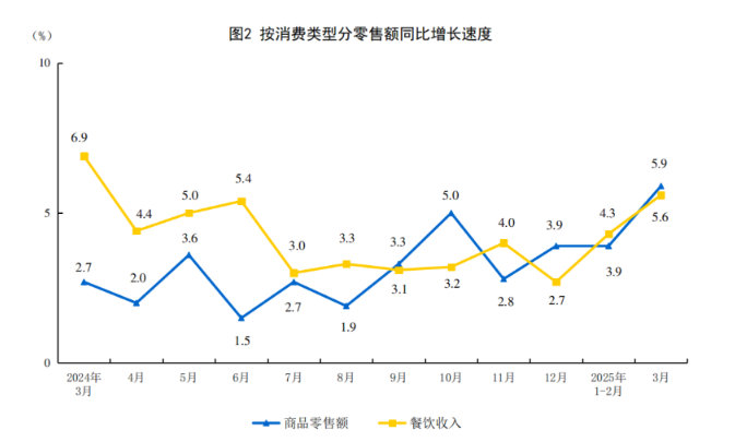 按消费类型分,3月份,商品零售额36705亿元,同比增长5.9%;餐饮收入4235亿元,增长5.6%。1-3月份,商品零售额110644亿元,增长4.6%;餐饮收入14027亿元,增长4.7%。