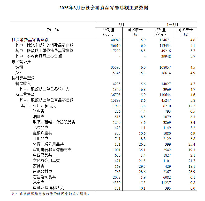 按经营单位所在地分,3月份,城镇消费品零售额35595亿元,同比增长6.0%;乡村消费品零售额5345亿元,增长5.3%。1-3月份,城镇消费品零售额108057亿元,增长4.5%;乡村消费品零售额16614亿元,增长4.9%。