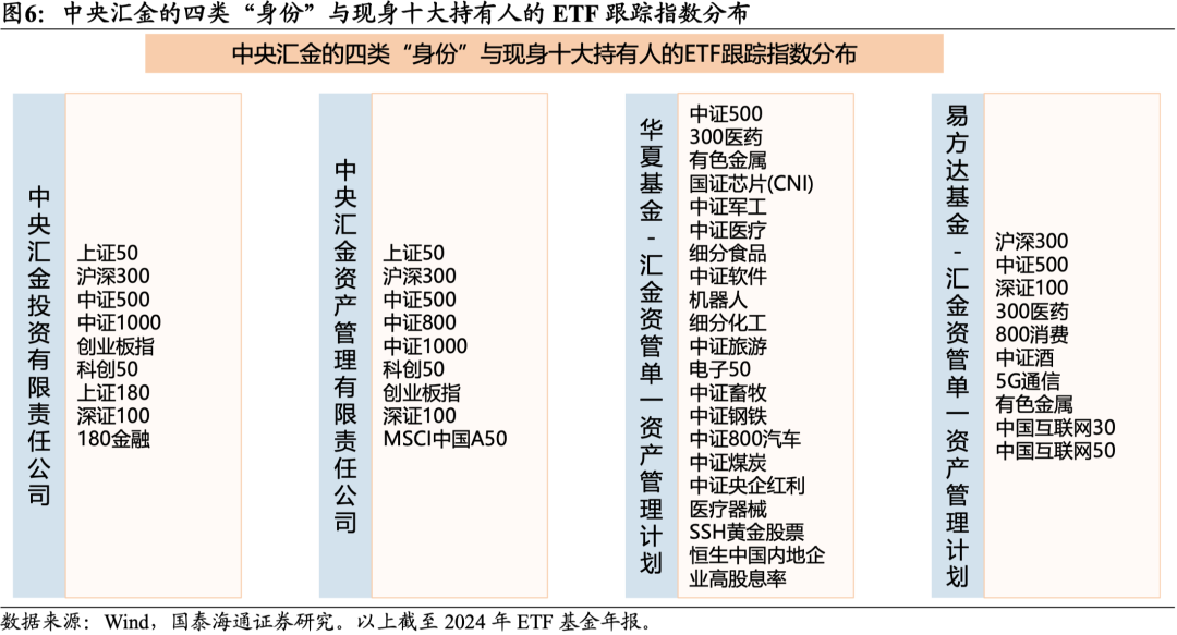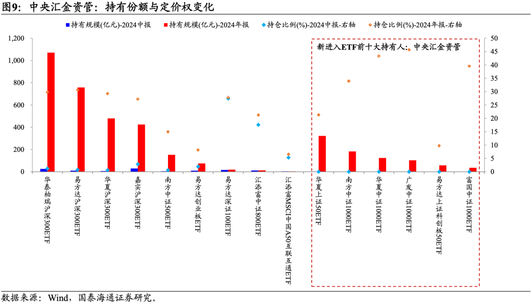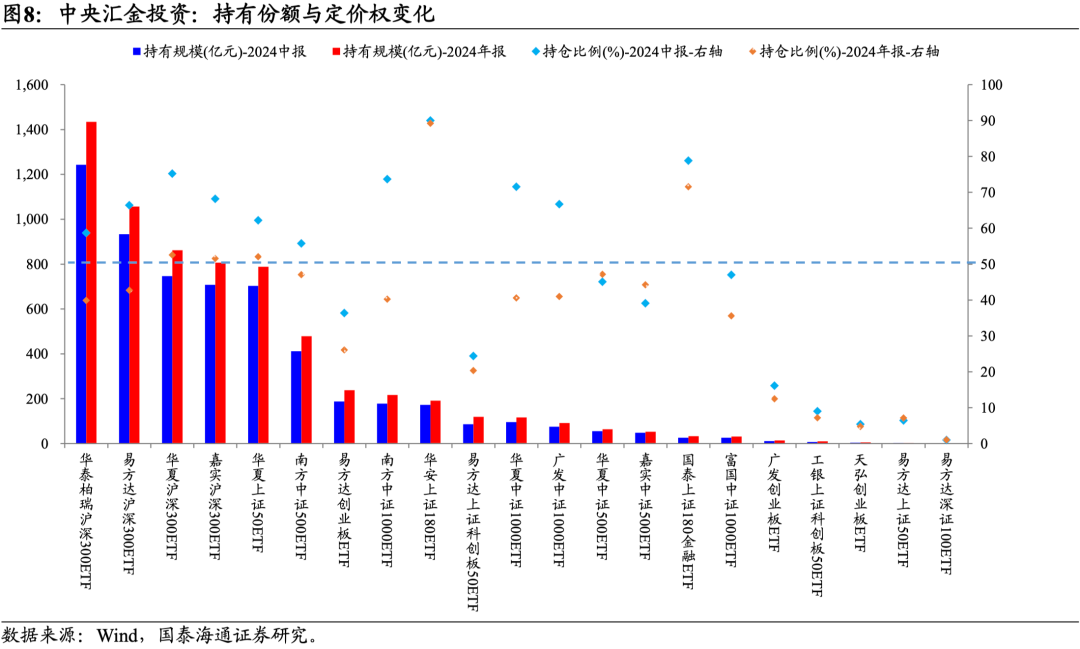 增量资金的结构与方向:ETF增量品种扩散,科技成长的定价权显著攀升。2024年下半年,中央汇金持有的ETF规模及品种增加,合计持有ETF规模达到10530亿元。1)对于中央汇金投资,尽管持有沪深300ETF、上证50ETF、中证500ETF等传统宽基品种未变,但其持有的ETF总规模从2024年中的5722亿元,增加至年末的6617亿元。从平均持仓比例看,由2024年中的47.48%边际下降至2024年末的36.87%,且在多个ETF品种仍超过50%。2)对于中央汇金资管,2024下半年持仓规模新增3705亿元,加仓方向为上证50、中证1000、科创板50ETF等。这意味着,汇金不仅在大盘价值板块持续布局,在科技成长方向的影响力也在加强。值得注意的是,2024年末中央汇金资管在其出现的ETF品种平均持仓比例为25.94%,相较于2024年中的3.88%,其定价权显著攀升。