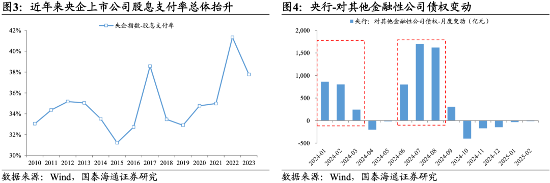 ▶增量资金的来源:兼具多元化与稳定性。其中,中央汇金公司作为重要的参与主体,其资金来源主要体现在以下三个方面:1)作为国有金融资本受托管理机构,中央汇金公司经营稳健,这为其参与维护资本市场稳定提供了坚实的自有资金基础。2025年2月,财政部向中央汇金划转数家金融机构股权,包括三大 AMC 与中国农业再保险,强化了汇金作为国有金融资本受托管理机构的资产实力。2)每年获得的稳定现金分红使其可动用的自有资金规模较大,能够为市场提供及时的资金支持。3)经过多年发展,其已建立起覆盖短中长期限、成熟稳定的市场融资渠道。此外,还可获得央行的流动性支持,这进一步增强了其资金实力和市场干预能力。事实上,央行资产负债表“对其他金融性公司债权”项目在2024年一季度和三季度分别新增了 1907亿元、3627 亿元,亦对应了托底资本市场的重要节点。