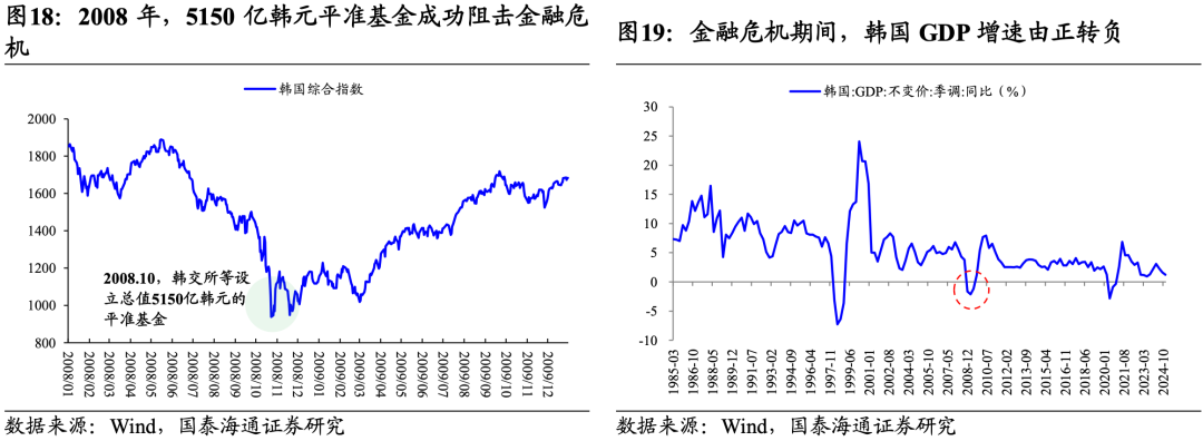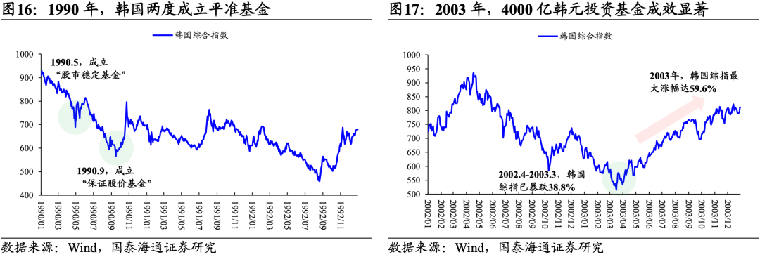 2)2003年:由于韩国经济增速下滑并出现信用卡危机,韩交所、韩国证券业协会、韩国证券保管中心共同设立了总值4000亿韩元的投资基金,其中韩交所出资50%。叠加韩国GDP增速见底回升、以及配套一系列利好政策,韩国此次“平准基金”的稳定市场效果十分显著。截至2003年底,韩指最大涨幅达59.6%。