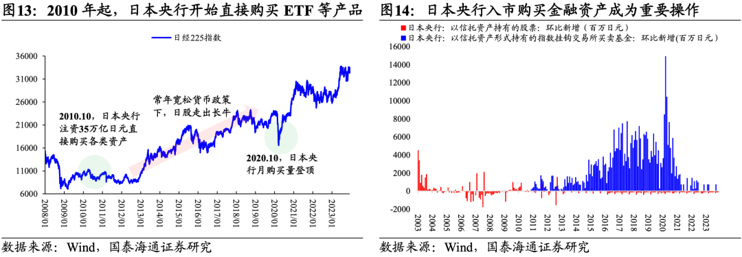 历史上,平准基金亦多次入市,方式愈发直接,但生效时滞往往较长。1995年6月,日本政府成立“股市安定基金”以阻击狂跌的日经指数,此番资金入市一定程度上修复了市场信心。但由于资产泡沫破裂,叠加亚洲金融危机蔓延,日本经济出现“失去的十年”。直至2005年日本一揽子振兴经济计划开花结果,配合平准基金的外部干预,日经指数才重返16000点。同时,2002-2004年间,日本央行亦通过“股票购买计划”开始购买商业银行所持有的股票,为商业银行曲线“注资”,这一做法与当前汇金增持四大行的操作可谓异曲同工。2010年,由于经济复苏疲软,日本央行于10月28日创立总额为35万亿日元的基金,用于直接购买股票、ETF等各类资产为市场提供流动性。此后,央行资金入市成为重要操作,日本央行每年购入大量金融资产,至2020年疫情期间月购买量达到历史峰值。而日本股市在2010-2012年间以横盘震荡为主,直到2013年之后市场才逐步改善。