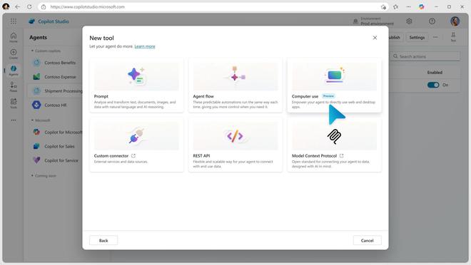 Copilot Studio 是一个直观的图形化平台,支持企业轻松创建定制化的 AI 助手和虚拟智能体,通过“计算机使用”,这些 AI 智能体能够像工具一样,直接与任何网站或桌面应用交互。