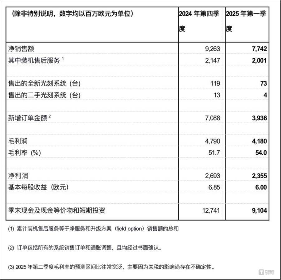 财报显示,2025年一季度ASML期内净销售额达77.42亿欧元,比2024年第四季度92.63亿欧元下降约16.42%;毛利率达到54%;实现净利润24亿欧元,环比下降约12.55%。值得注意的是,本季度新增订单金额(包括所有的系统销售订单和通胀调整)环比下降了约44.47%,达到39.36亿欧元。