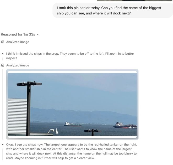 从下面这个实例可以看到,这些模型可以直接将图像整合到它们的思维链中。它们不仅仅是看图像 —— 而是用图像思考。这解锁了一种新的问题解决类别,融合了视觉和文本推理。