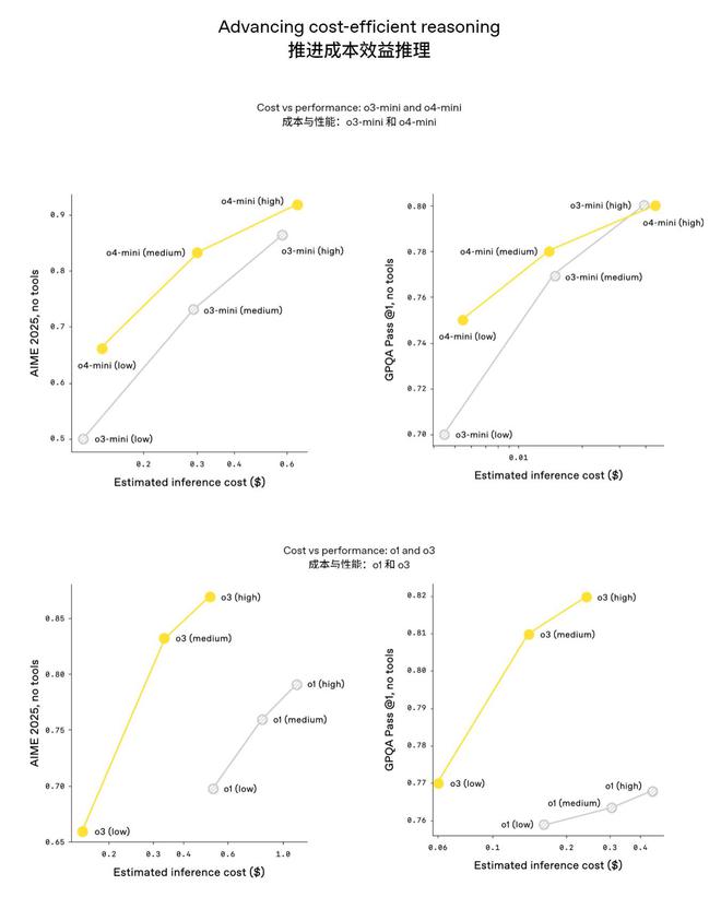 从成本来看,OpenAI 号称 o3 和 o4-mini 是其发布过的最智能的模型,它们通常也比 o1 和 o3-mini 更高效。例如,在 2025 AIME 数学竞赛中,o3 的性价比优于 o1;同样,o4-mini 也优于 o3-mini。