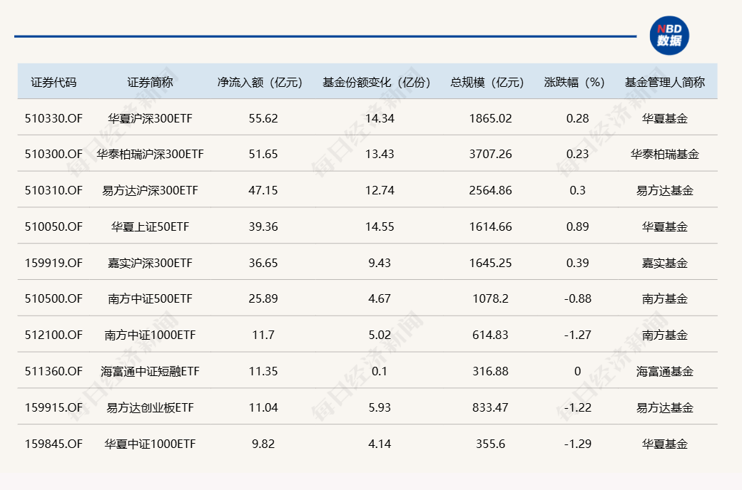Wind数据显示,在4月16日的非货币ETF市场中,华夏沪深300ETF基金份额增加14.34亿份,净流入额为55.62亿元;华泰柏瑞沪深300ETF份额增加13.43亿份,净流入额为51.65亿元;易方达沪深300ETF份额增加12.74亿份,净流入额为47.15亿元。