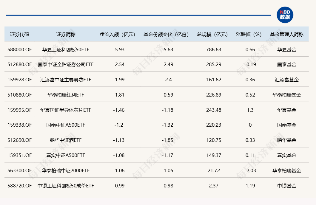 与此同时,华夏上证科创板50ETF基金份额减少5.63亿份,净流出额为5.93亿元;国泰中证全指证券公司ETF份额减少2.49亿份,净流出额为2.54亿元;汇添富中证主要消费ETF份额减少2.4亿份,净流出额为1.99亿元。