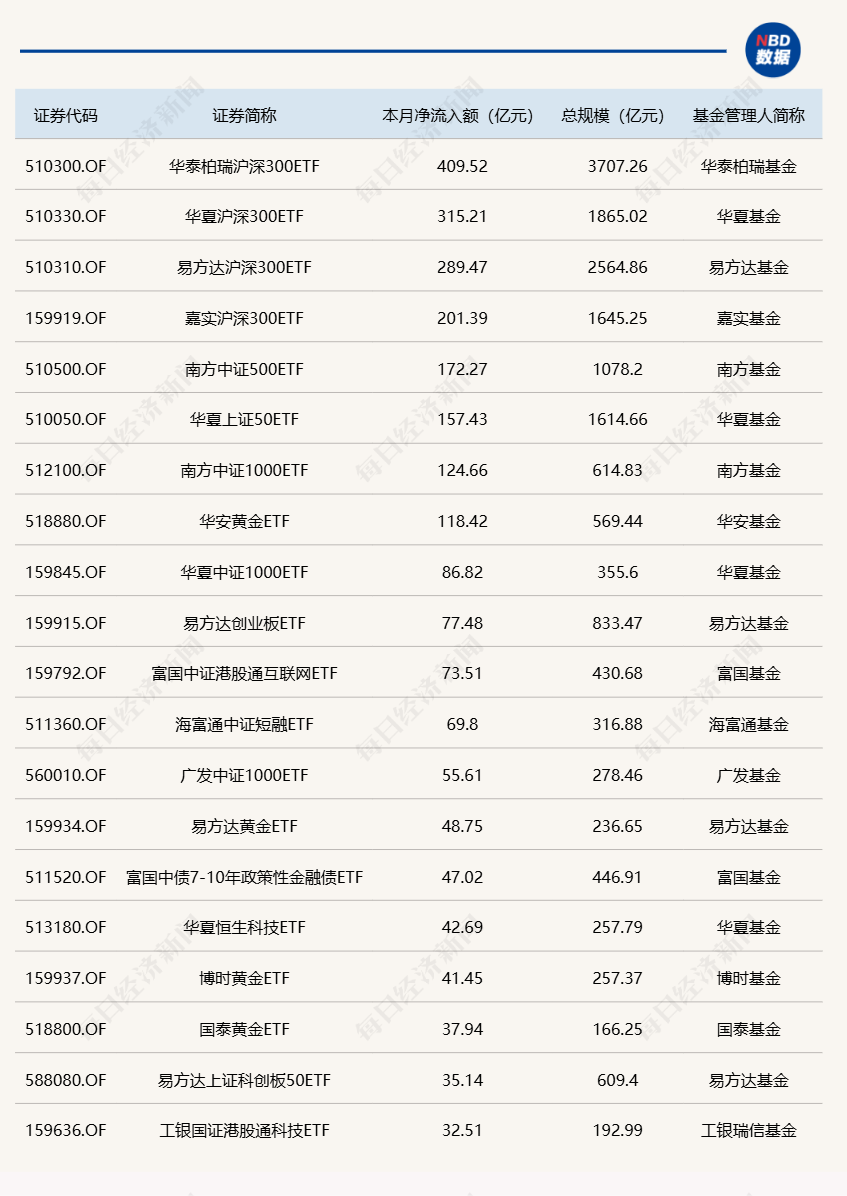 值得注意的是,场内规模较大的4只沪深300ETF(华泰柏瑞、易方达、华夏、嘉实)昨日再度异动,全天合计净流入超191亿元。华夏上证50ETF、南方中证500ETF单日净流入额也都超过了25亿元。