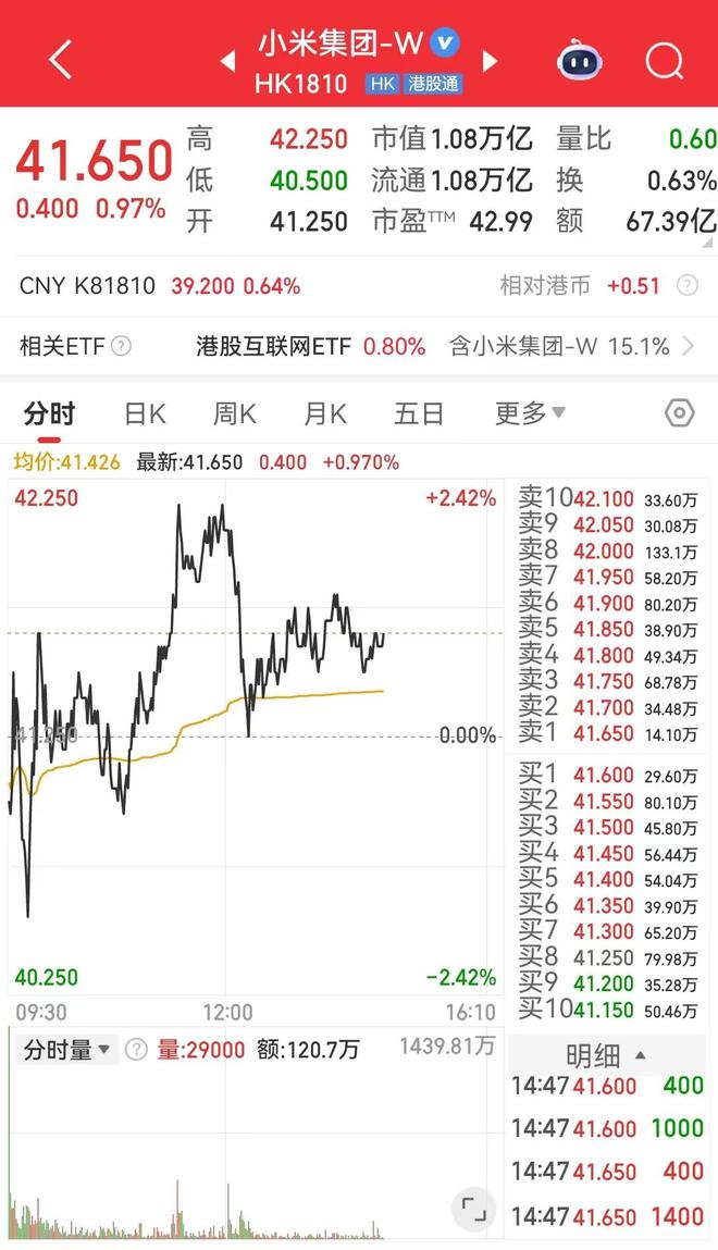 截至4月17日发稿,小米集团-W(HK1810)报41.65港元,涨幅0.97%,市值1.08万亿港元。