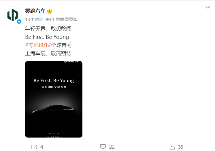 此外,零跑 B01 将于 2025 年 4 月 23 日上海车展开启全球首秀,地址位于上海国家会展中心 6.2H 馆-6B11 零跑展台。据零跑的合作伙伴大会披露信息,B01 轿车计划于 7 月上市,B05 将于 11 月左右广州车展开启预售,D 系列则在今年年底正式亮相。