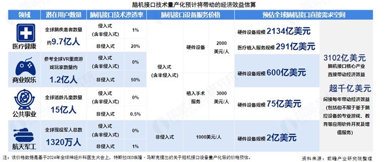 脑机接口技术的应用潜力巨大,其中医疗健康和商业娱乐是重点关注的应用场景,基于特斯拉CEO马斯克提到的脑机接口设备若进行大规模量产,价格大概将在1000美元至2000美元,包含手术费用整体也将仅在5000美元左右。基于此初步估算,未来随着脑机接口的技术成熟,预估全球脑机接口产业将直接产生超过3000亿美元的经济价值。