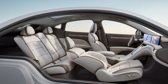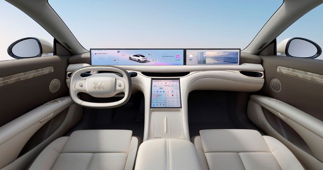 内饰采用"大地象灰"配色,搭配星漩羽韵高定饰件,现代简约。超广角视野全幅方向盘、可调节副驾太空椅模式等内饰设计进一步体现了智己对用户驾乘舒适性的重视程度。