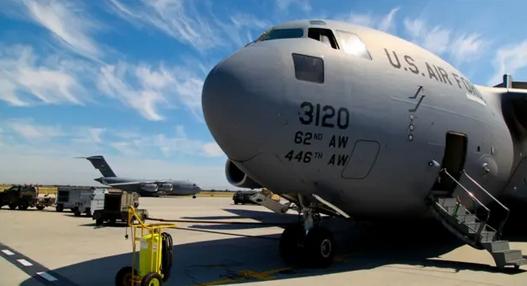 在玛纳斯机场,美军使用大型C-17运输机为阿富汗前线运送部队和物资BBC