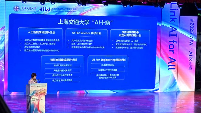 记者从现场获悉,“AI十条”背后,这一改革方案以上海交大党委书记杨振斌和校长、中国科学院院士丁奎岭为组长的工作推进小组为核心,整合科研院、网络信息中心、人工智能学院等多部门力量,确保各项举措落地见效。“AI十条”聚焦人工智能学科跃升、AI For Science种子计划、智慧文科建设、AI+应用场景创新等十大领域,旨在夯实交大在全球人工智能领域的引领地位,推动AI技术在科学研究、工程技术、医学突破等方向的深度应用。