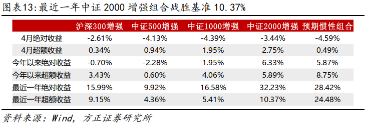 上周,方正金工沪深300指数增强组合周超额收益为0.64%,中证500指数增强组合周超额收益为0.98%,中证1000指数增强组合周超额收益为0.73%,中证2000指数增强组合周超额收益为1.51%,“预期惯性”组合超额收益为2.34%。