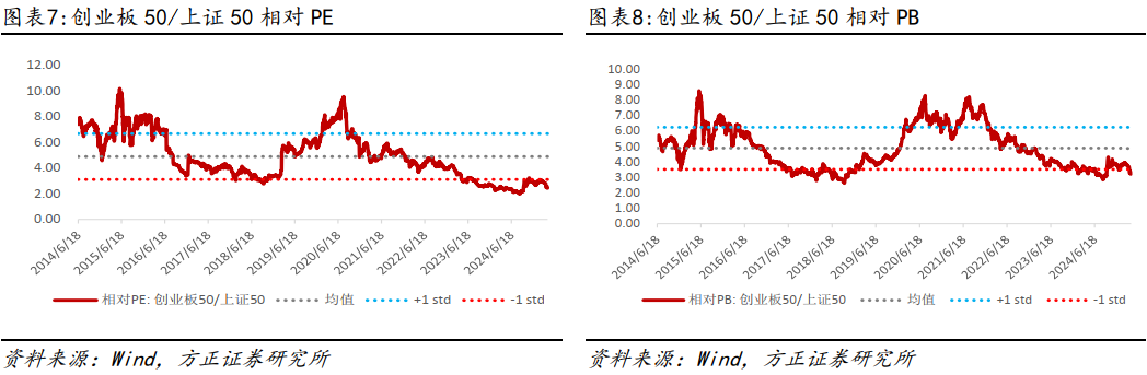 从相对估值来看,截至2025年4月18日,创业板指相对于沪深300指数相对PE为2.36倍,位于历史3.8%分位数,相对PB为2.74倍,位于历史28.7%分位数。创业板50指数相对于上证50指数相对PE为2.44倍,位于历史5.3%分位数,相对PB为3.22倍,位于历史7.1%分位数。