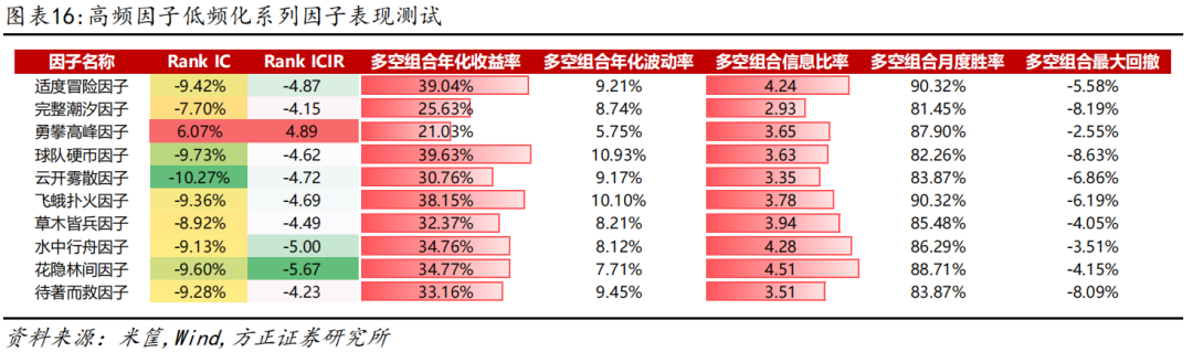 在方正金工多因子选股系列研究中,我们分别构建了“适度冒险”、“完整潮汐”、“勇攀高峰”、“球队硬币”、“云开雾散”、“飞蛾扑火”、“草木皆兵”、“水中行舟”、“花隐林间”、“待著而救”、“多空博弈”等11个特色量价因子,其中除“球队硬币”因子数据源为日频数据外,其余所有因子均根据分钟频数据计算得到,为了降低因子换手率,我们对所有的因子进行了月度频率的平滑处理,即高频因子低频化处理。