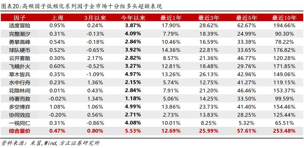 在方正金工多因子选股系列研究中,我们分别构建了“适度冒险”、“完整潮汐”、“勇攀高峰”、“球队硬币”、“云开雾散”、“飞蛾扑火”、“草木皆兵”、“水中行舟”、“花隐林间”、“待著而救”、“多空博弈”等11个特色量价因子。上述因子虽然由高频数据计算得到,但是在月度频率上仍然有较为出色的选股能力,我们对十一个量价因子的测试,可以看到,所有因子的RankICIR绝对值都在4.0以上。今年以来,其中11个细分因子合成的综合量价因子今年以来全市场十分组多空组合相对收益为13.07%,多头组合超额收益为5.53%。