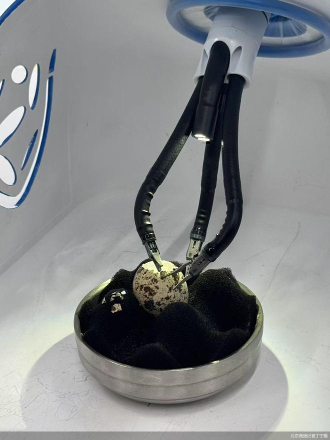 走进术锐生产基地,只见一台长着4条蛇形手术臂的机器人,正通过直径25mm的单孔通道,在狭小空间内完成生鹌鹑蛋剥壳,鹌鹑蛋壳平均厚度仅0.2毫米,其下方蛋膜更薄至50微米,剥好的蛋体非常完整。