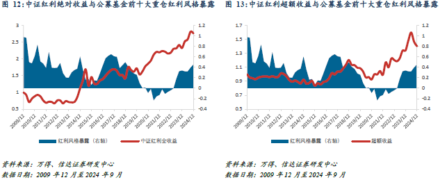 当前偏股型公募基金红利风格暴露在2023年Q2转正,2024Q3暴露度为0.39,最新2024Q4暴露度为0.45,在红利风格上仍然维持正向配置,且红利暴露度创2019年以来新高。