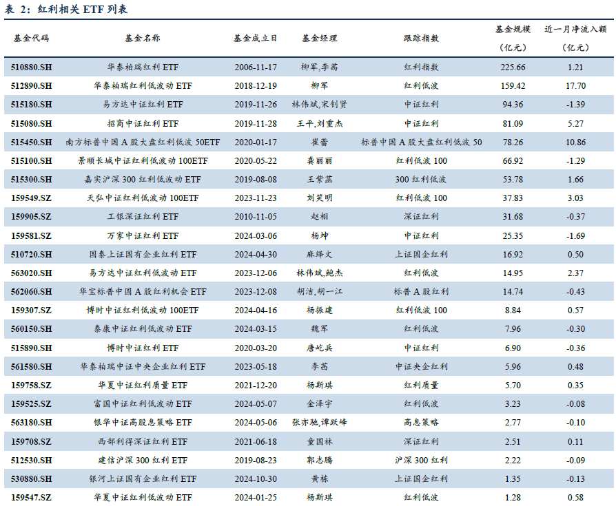 统计市场上所有A股红利类ETF的每日资金净流入情况(筛选规则:基金跟踪指数中包含“红利”或“股息”关键字,剔除未成立、已到期的基金,和投资于港股的基金,以及ETF联接基金)。今年以来,A股投资者持续买入红利类ETF,中证红利走势与ETF资金流入流出情况一定程度呈正相关。