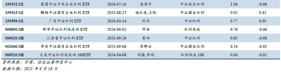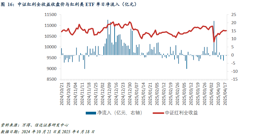 根据红利ETF资金流跟踪可以看到,在2024年12月红利ETF有较大幅度的净流入,2025年1月至3月中旬,红利ETF流入幅度有所减缓。本周红利ETF净流入合计-6.52亿元,近一月红利类ETF合计净流入38.69亿元。