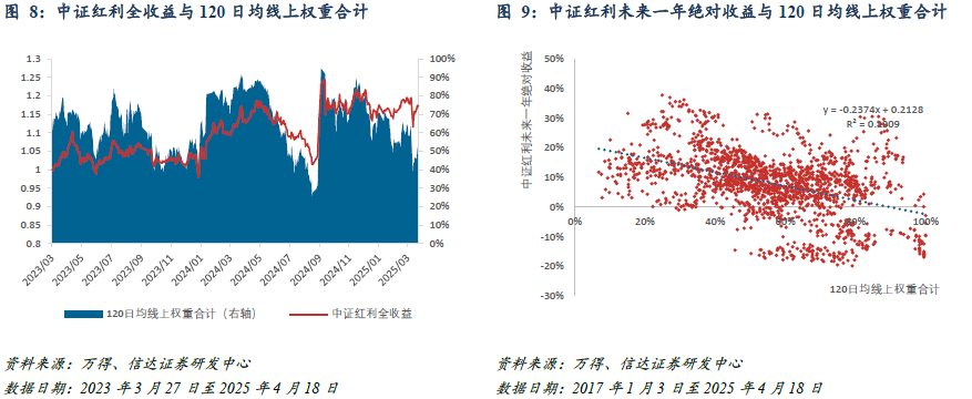 截至2025年4月18日,中证红利成分股合计51.07%权重位于半年均线以上,一个月前为64.44%,带入回归方程,回归模型估计未来一年绝对收益为9.15%。