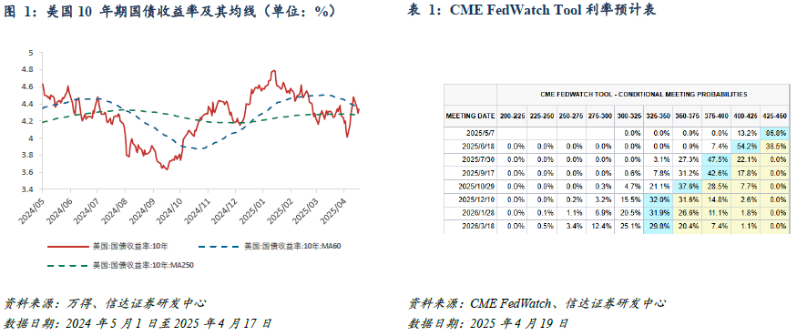 近期美债收益率受美联储降息预期影响。根据CME FedWatch Tool统计,预期2025年6月降息概率为61.5%,7月再次降息概率77.9%,美债利率60日均线上穿250日均线,在美债端模型给出看多红利的信号。