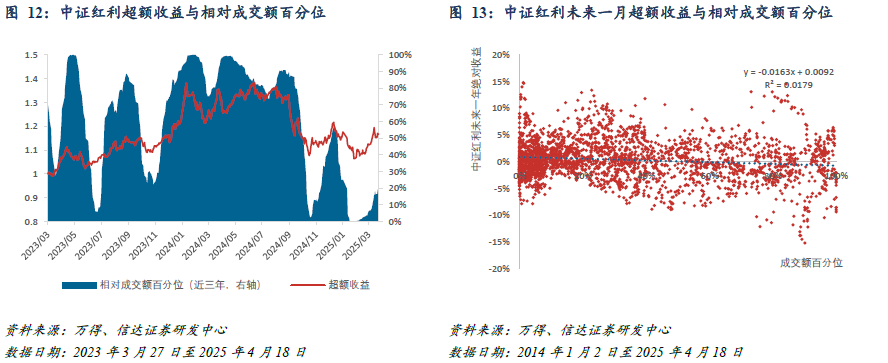 截至2025年4月18日,中证红利相对成交额近三年位于20.29%百分位,一个月前为2.94%百分位,当前相对成交拥挤度回归历史低位,带入回归方程,回归模型估计未来一月超额收益为0.60%。