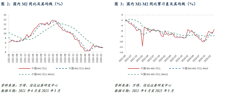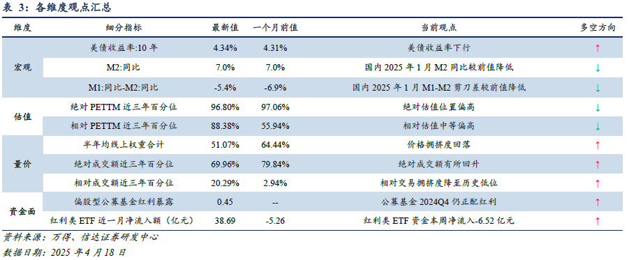 国内宏观层面,国家统计局于2025年4月13日公布了2025年3月份经济数据,2025年3月国内M2同比为7.0%,前值为7.0%。M1-M2同比剪刀差为-5.4%,前值为-6.9%。国内M2同比自2024年8月开始回升,M1-M2同比剪刀差自2024年9月开始回升,当前两者3月均线皆上穿12月均线,长期上行趋势或初步确认,M2同比维度与M1-M2同比剪刀差维度皆看空红利超额。