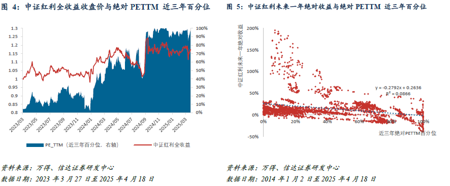 截至2025年4月18日,中证红利绝对成交额处于近三年69.96%百分位,一个月前为79.84%百分位,绝对成交拥挤度较2月低位有所回升,带入回归方程,回归模型估计未来一年绝对收益为7.52%。