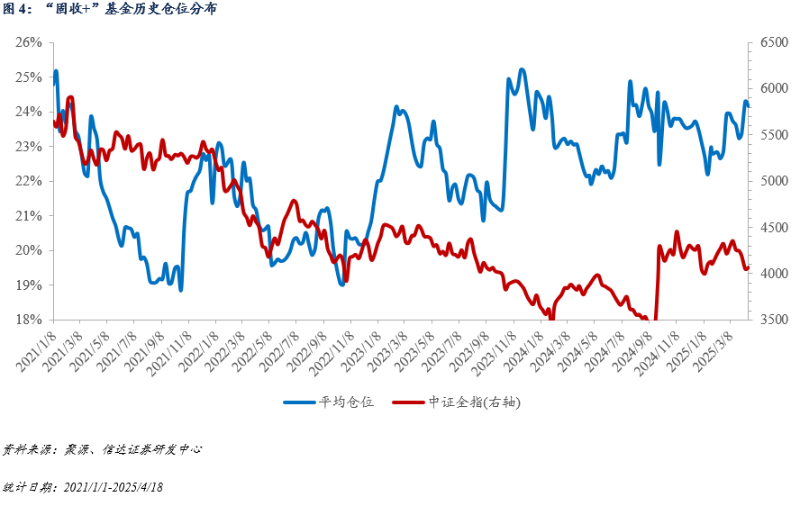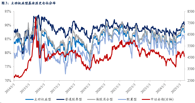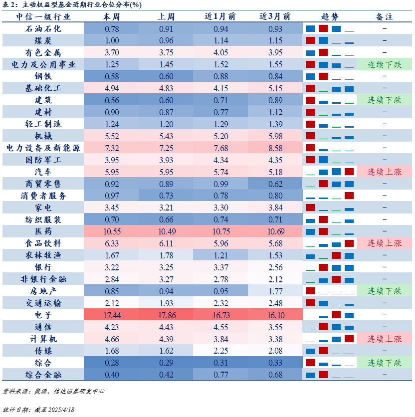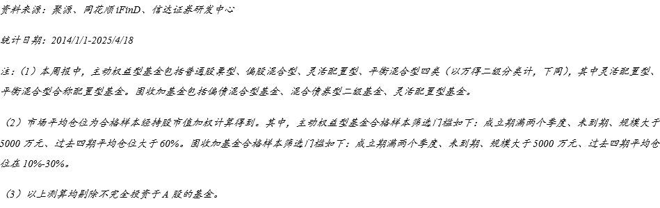 主动权益基金测算仓位自3月底以来持续下调,或反映主动股基通过降低权益敞口进行防御性调仓。截至2025/4/18,主动权益型基金的平均仓位约为87.32%。其中,普通股票型基金的平均仓位约为90.14%(较上周下降0.06pct),偏股混合型基金的平均仓位约为88.04%(较上周下降0.16pct),配置型基金的平均仓位约为84.81%(较上周下降0.23pct);“固收+”基金平均仓位约为24.16%,较上周下降0.13pct。