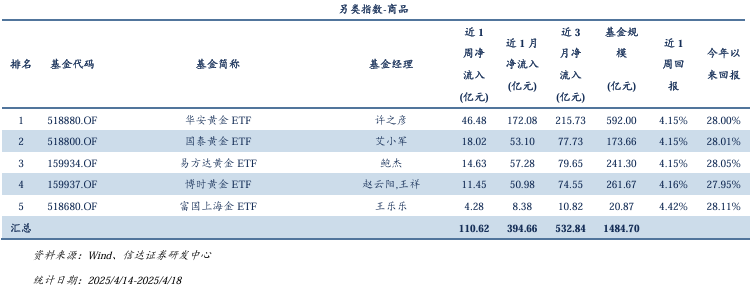 本周(2025/4/14-2025/4/18),境内股票指数ETF资金合计净流入约354.45亿元,合计规模为29542.24亿元;境外指数ETF合计净流入约45.73亿元,合计规模为4957.5亿元;债券指数ETF合计净流入约82.31亿元,合计规模为2390.59亿元;商品指数ETF合计净流入约110.62亿元,合计规模为1484.7亿元。