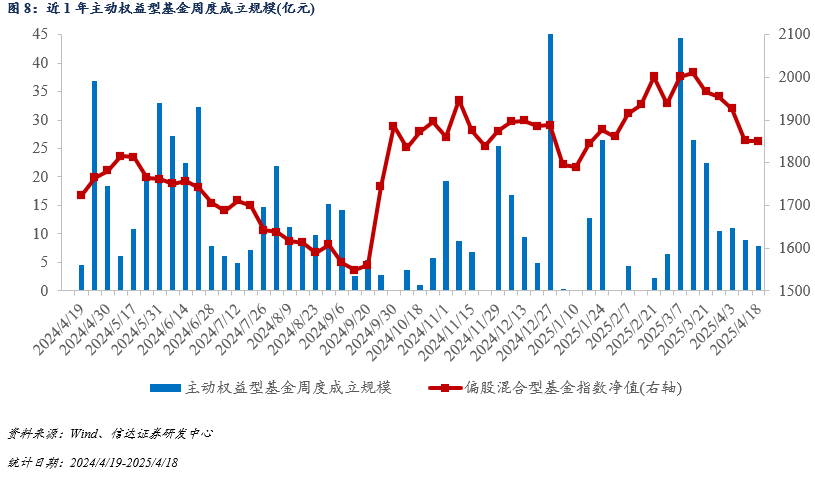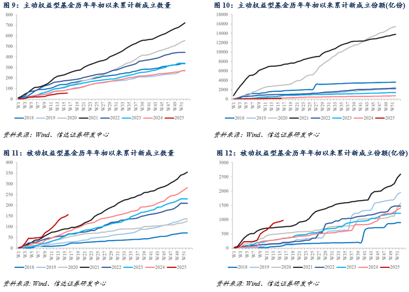 本周境内新成立基金数目共计25只,其中主动权益型基金2只;主动权益型基金新发总份额约为7.9亿份,为近1年42.3%分位。2024年主动权益型基金新发269只,规模合计约720.26亿份,约为2023年同期水平的52%;被动权益型基金新发285只,规模合计约1420.14亿元,规模远超2023年同期。今年以来,主动权益型基金新发57只,规模合计约184.65亿元,约为2024年同期水平的71.39%;被动权益型基金新发157只,规模合计976.7亿元,规模远超2024年同期。