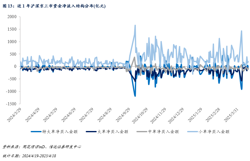 本章的统计基于同花顺对主力资金的划分,标准如下:(1)特大单:成交量在20万股以上,或成交金额在100 万元以上的成交单;(2)大单:成交量在6万股到20万股之间,或成交金额在30万到100万之间,或成交量占 流通盘0.1%的成交单;(3)中单:成交量在1万股与6万股之间,或成交金额在5万到30万之间的成交单;(4)小单:成交量在1万股以下,或成交金额在5万元以下的成交单。