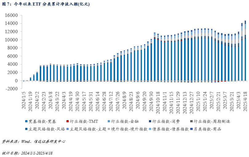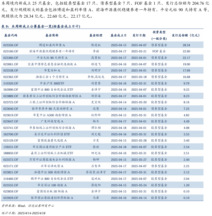 宽基指数表现回顾:本周(2025/4/14-2025/4/18)市场缩量震荡,观望情绪愈加浓厚,宽基指数韧性较强;结构上,资金加速向防御性资产迁移,大盘价值、红利、北证领涨。截至2025/4/18,上证指数报收3276.73点,周涨跌幅约1.19%;深证成指报收9781.65点,周涨跌幅约-0.54%;创业板指报收1913.97点,周涨跌幅约-0.64%;沪深300报收3772.52点,周涨跌幅约0.59%。