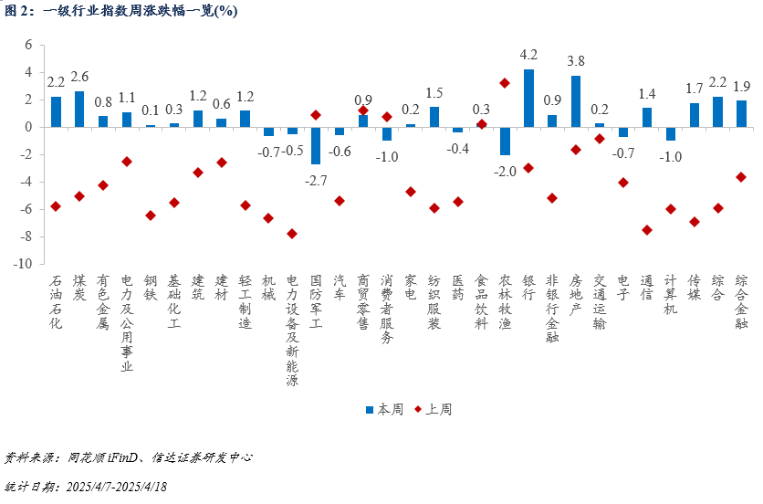 行业指数表现回顾:本周(2025/4/14-2025/4/18)市场风偏整体回落,金融地产、上游周期涨幅居前。周涨跌幅排名居前的行业有银行、房地产、煤炭、综合、石油石化等,收益率依次为4.22%、3.78%、2.62%、2.24%、2.24%;周涨跌幅排名靠后的行业包括国防军工、农林牧渔、计算机、消费者服务、电子等,收益率依次为-2.73%、-2.03%、-0.98%、-0.98%、-0.70%。