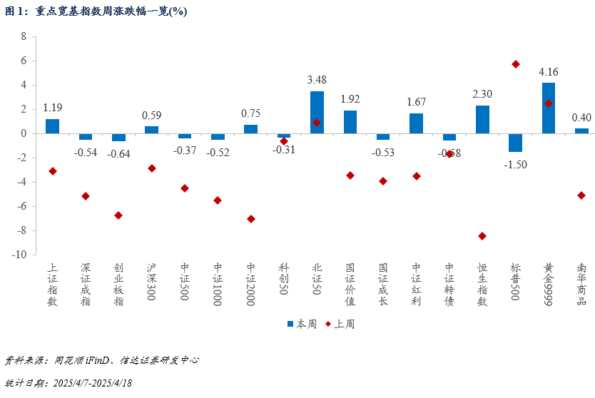 本周市场复盘:本周市场缩量震荡,周五(2025/4/18)沪深两市成交金额仅9147亿元,创“924”以来地量水平,观望情绪愈加浓厚;这反映出,弱复苏背景叠加关税冲击下,“存量市”的属性尚未得到根本性转变。尽管关税预期波动持续,但市场整体对关税增量变化的反应有所钝化;与此同时,得益于金融资产、上游资源等板块的较好防御性,主要宽基指数韧性较强,资金对国内政策仍抱有充分期待。