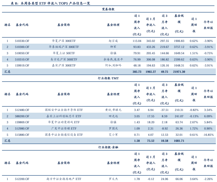 宽基ETF方面,本周资金净流入约385.73亿元,合计规模为21971.3亿元。其中,净流入较多的产品为华夏沪深300ETF、华泰柏瑞沪深300ETF、华夏上证50ETF、易方达沪深300ETF、嘉实沪深300ETF,净流入金额分别为115.04亿元、93.83亿元、79.91亿元、76.99亿元、48.18亿元。