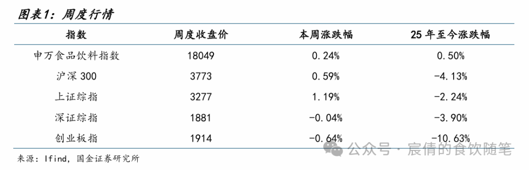 本周(4.14-4.18)食品饮料(申万)指数收于18049点(+0.24%),沪深300指数收于3773点(+0.59%),上证综指收于3277点(+1.19%),深证综指收于1881点(-0.04%),创业板指收于1914点(-0.64%)。