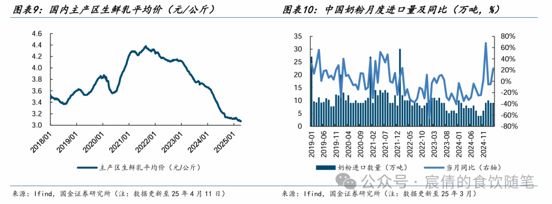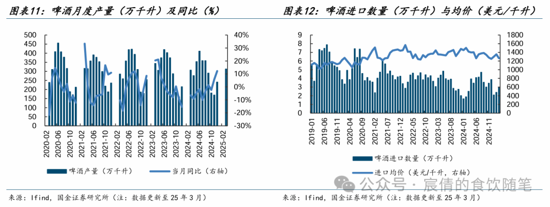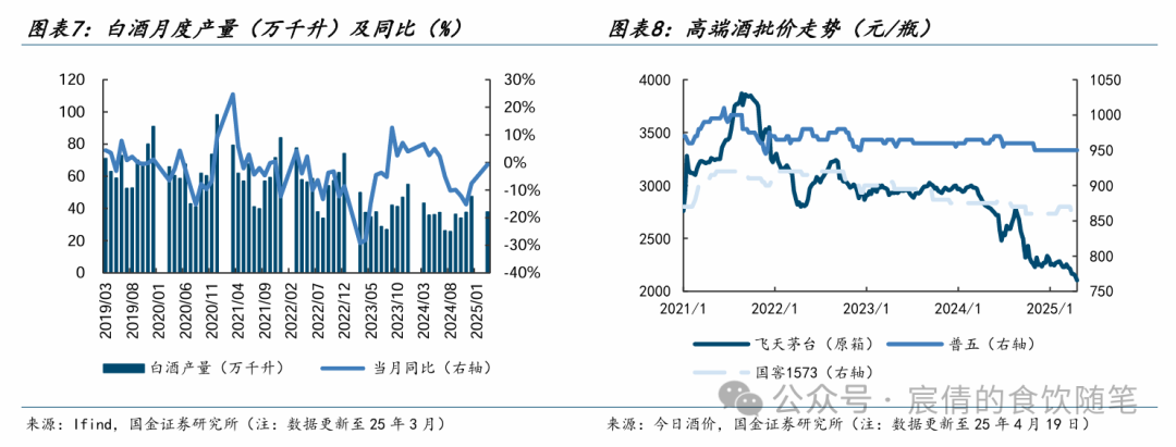 软饮料:行业逐步进入旺季,景气度拐点向上。3月限额以上饮料类累计同比增速-0.5%,降幅持续收窄。去年同期受雨水天气影响,呈现明显的低基数红利,我们预计多数企业有望在4月展现出较强的修复态势。持续推荐包装水市占率回补+东方树叶高成长的农夫山泉。以及大单品拓展人群+第二曲线快速铺货的东鹏饮料,果汁茶新品上市反馈较好,Q1业绩持续超预期(25Q1实现营收48.48亿元,同比+39.23%;实现归母净利润9.80亿元,同比+47.62%)。