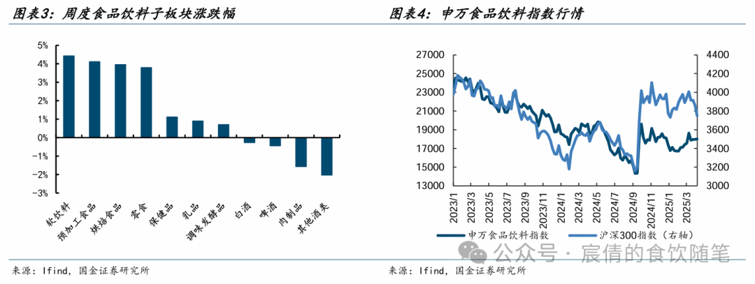 从食品饮料子板块来看,涨跌幅前三的板块为软饮料(+4.42%)、预加工食品(+4.11%)、烘焙食品(+3.95%)。