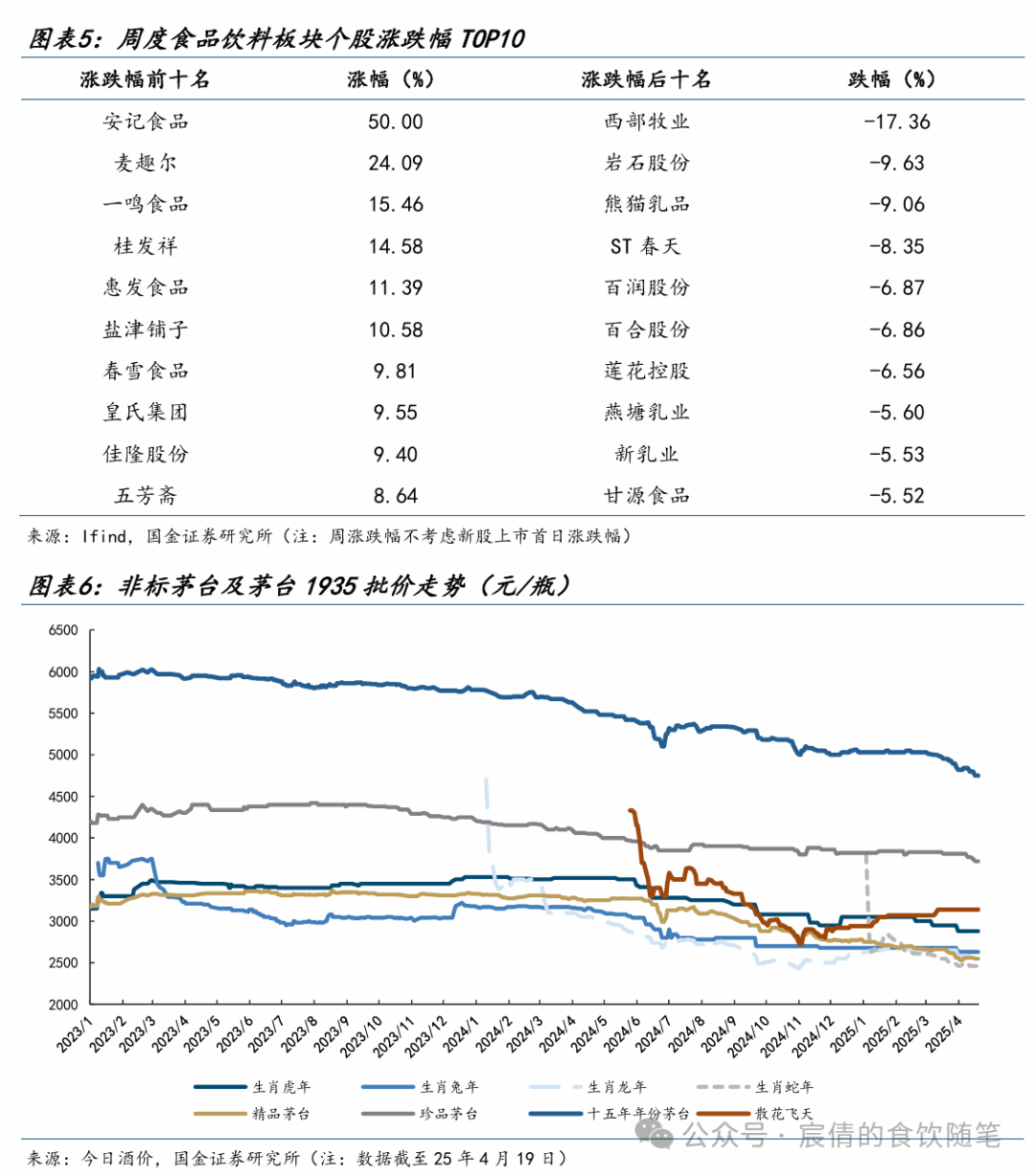 从个股表现来看,周度涨跌幅居前的为:安记食品(+50.00%)、麦趣尔(+24.09%)、一鸣食品(+15.46%)、桂发祥(+14.58%)、惠发食品(+11.39%)等。涨跌幅靠后的为:西部牧业(-17.36%)、岩石股份(-9.63%)、熊猫乳品(-9.06%)、ST春天(-8.35%)、百润股份(-6.87%)等。