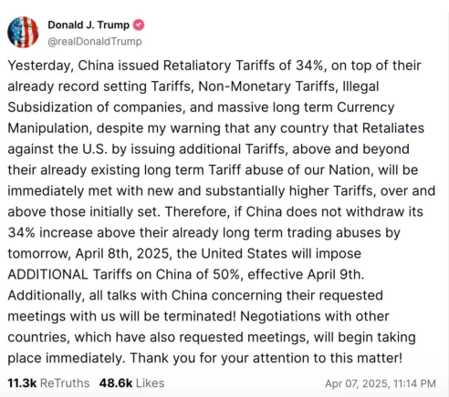 在中国发起对等关税的反制措施之后,特朗普7号发文要对中国实施更高级别的关税。
