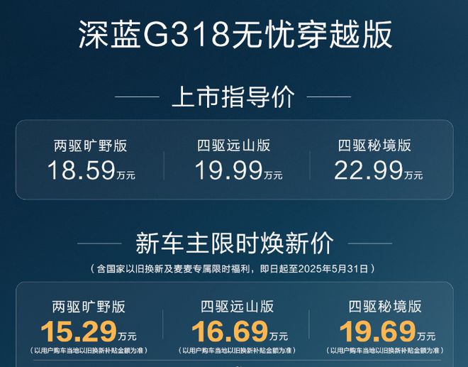 4月18日,深蓝G318无忧穿越版正式上市,提供两驱旷野版、四驱远山版、四驱秘境版三个版本,售价区间18.59万—22.99万元,含以旧换新等补贴的限时售价为15.29万—19.69万元。