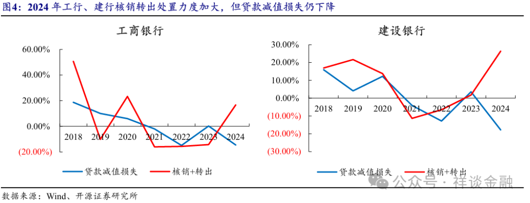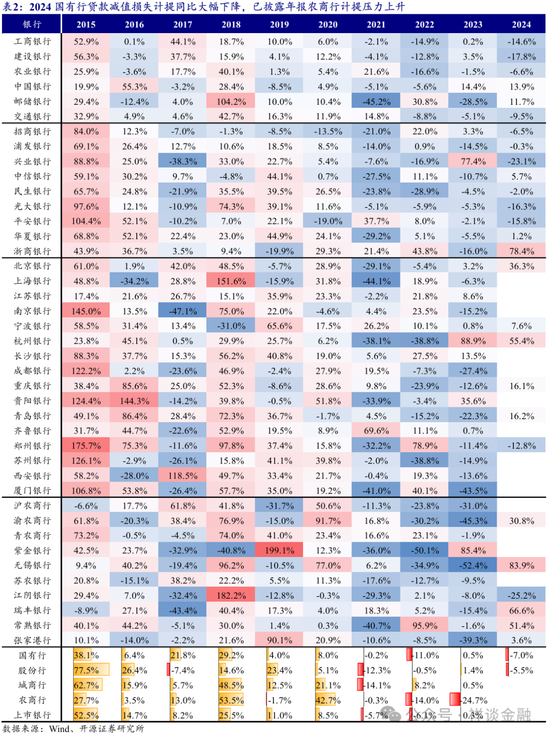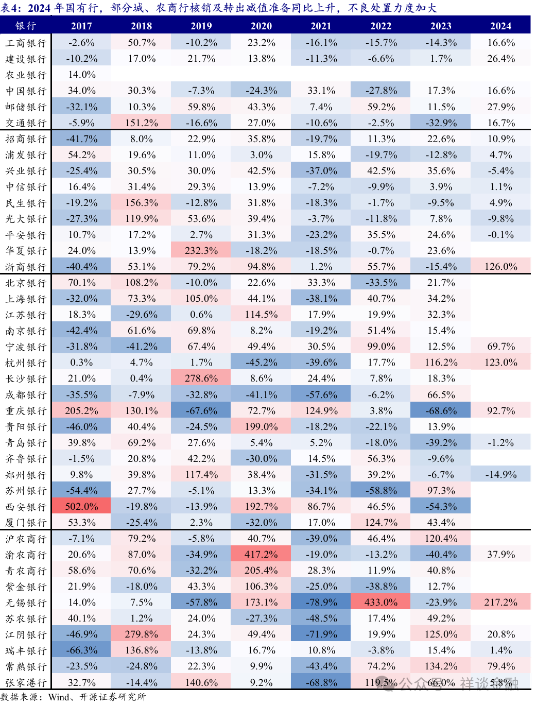 不良资产处置力度并和方式均影响拨备计提。2024年国有行加大了对存量不良的处置,与此同时少计提减值损失,主要源于国有行处置方式以清收为主,清收形成的现金回拨减少了当期计提。部分城、农商行处置方式以核销为主,故需补计提拨备,增加了当期的减值损失。